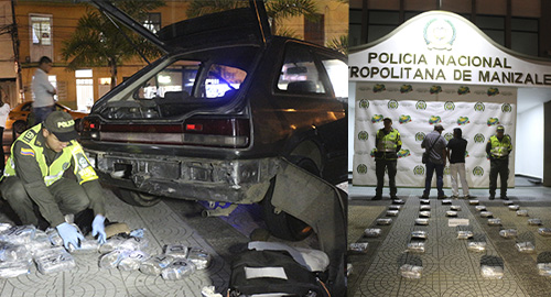 Un nuevo caso de trasporte de estupefacientes sobre el eje vial que comunica a la ciudad de Manizales fue descubierto por nuestros uniformados de la especialidad de Tránsito y Trasporte, dentro de un repuesto en el baúl de un vehículoEn el procedimiento policial, los uniformados mediante puesto de control detienen la marcha de un vehículo, al solicitarle la documentación requerida a los integrantes del vehículo demostraron con su expresión corporal nerviosismo, lo que motivo a nuestros uniformados a seguir entrevistándolos y a revisar el automotor detalladamente. Un toque superficial al repuesto que se encontraba en el baúl le indico que dentro de éste habría algo anormal, en acto seguido los policiales revisan minuciosamente el repuesto encontrando dentro del mismo el estupefaciente. Al desarmar el repuesto y el baúl del vehículo encontraron un novedoso compartimento del cual sacaron 35 paquetes cada uno con una sustancia similar a la marihuana los cuales sumaban un total 20 kilos, con la que se hubiera podido fabricar aproximadamente 20.000 mil dosis.Invitamos a toda la comunidad en general a denunciar todo hecho delictivo a nuestras líneas efectivas 123 y 112.