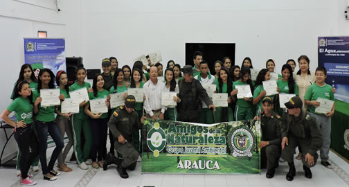 En desarrollo del Plan Integral Policial para la Convivencia y Seguridad Ciudadana, con la finalidad de concienciar a la comunidad en general sobre la preservación y cuidado de la fauna y la flora, la Policía Nacional en un trabajo interinstitucional con la empresa Coorporinoquia y los Docentes de diferentes planteles educativos hicieron  realidad la clausura del proyecto "Amigos de la Naturaleza".Este evento de clausura se realizó en las instalaciones del Auditorio de la Cámara de Comercio, en el cual asistieron más de 30 estudiantes de los grados 11, de las instituciones educativas Simón Bolívar y Cristo Rey, en coordinación con el Grupo de Protección Ambiental y Ecológica, quienes impartieron capacitación en normas ambientales y ecológicas, con el propósito de que sean líderes de la protección de los recursos naturales de la comunidad en general.Además de convertirse en los multiplicadores de los buenos hábitos en torno a los parques, humedales, cuencas hidrográficas y las diferentes especies de flora y fauna, la Policía Nacional ha venido vinculando a niños, niñas y adolescentes de los planteles educativos en el departamento.Los estudiantes que conformaron el grupo de "Amigos de la Naturaleza", fueron capacitados 80 horas por personal idóneo en temas ambientales y posteriormente apoyaron a nuestra Institución en la realización de campañas, celebraciones de fechas ambientales, uno de los temas fue; la protección a las especies en vías de extinción, especies silvestres en cautiverio como mascotas; protección animal; contaminación atmosférica y contaminación auditiva.El objetivo principal del grupo es crear conciencia ambiental en la población estudiantil con el fin de que contribuyan en contrarrestar y mitigar la problemática ambiental desarrollando tareas como: recuperación de parques y generación de conciencia para evitar que se arrojen basuras a ríos y fuentes hídricas.Este tipo de actividades permiten crear y promover una nueva cultura ambiental en nuestros niños (as) y jóvenes araucanos, con el propósito de que cada uno ellos tenga la capacidad de reconocer, mejorar y valorar el entorno en el que viven.Con la finalidad de que nuestros jóvenes sean cada día los protectores del medio ambiente evidenciando un alto grado de compromiso por el entorno que los rodea; la Policía Nacional le recuerda a la comunidad araucana la importancia de trabajar en las  alternativas de mejoramiento ambiental.