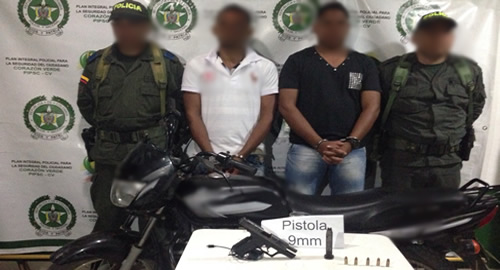 Tras varios meses de labores de investigación, uniformados capturaron a estos sujetos momentos en que se desplazaban en una motocicleta ocultando un arma de fuego con la que pretendían atentar contra la vida de un ciudadano dedicado al préstamo de dinero.Al parecer eran los encargados de llegar a los comerciantes de los municipios de Zaragoza y El Bagre en Antioquia para obtener dinero producto de extorsiones y amenazas. De acuerdo con la investigación habrían participado en la incineración de un vehículo distribuidor de cilindros de gas, aparentemente por el no pago de exigencias económicas. Finalmente fueron dejados a disposición de las autoridades competentes.La Policía en esta región ha logrado la captura de 167 integrantes de bandas criminales en lo trascurrido del año.