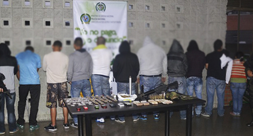 Estas personas venían afectando a la comunidad con extorsión al comercio, a residencias, al transporte público y a las constructoras del noroccidente de la ciudad.En el desarrollo del plan choque contra la extorsión "yo no pago yo denuncio", luego de un proceso de investigación se logró desplegar un operativo contra la banda delincuencial "matecaña" que delinquía en las comunas 5, 6 y 7 de la ciudad,El desarrollo de la operación se logra la captura de alias "búfalo" de 21 años de edad uno de los cabecillas de la banda delincuencial "matecaña" y principal cabecilla de la banda delincuencial "la 40". Igualmente mediante la operación fue capturado alias "barbas o Jimmy" de 29 años de edad, presunto cabecilla de la banda delincuencial "la 40", estas dos personas eran reconocidos tradicionalmente como integrantes de las estructuras ilegales en las comunas del noroccidente de Medellín, donde al parecer coordinaban el cobro de extorsiones al comercio formal e informal, residencias, constructoras y transporte público, la ejecución de homicidios selectivos, tráfico de estupefacientes y desplazamientos forzados.De igual manera fueron capturados mediante orden judicial los alias "esneider", "joncito", "calvo", "pipe", "el viejo", "Fredy", "champion" y "Jimmy o el negro" quienes eran solicitados mediante orden judicial por los delitos de concierto para delinquir agravado, desplazamiento forzado agravado y extorsión agravada.Estas personas fueron capturadas en flagrancia cuatro hombres de 23, 41, 46 y 51 años de edad y una mujer de 52 años de edad, a quienes se les halló en su poder.1 fusil colt, calibre 9mm, con 01 supresor de sonido, 01 proveedor con capacidad para 30 cartuchos y uno más con capacidad para 20. 1 proveedor y 17 cartuchos para fusil calibre 5.56800 gramos de marihuana14 millones de pesos en efectivo6 equipos celularesA esta banda delincuencial se le atribuye el desplazamiento de 11 familias aproximadamente en las comunas 5, 6 y 7 de Medellín y una serie de asonadas contra la nuestros uniformados en esta zona de la capital antioqueña.Los capturados y los elementos incautados fueron dejados ante la autoridad competente.