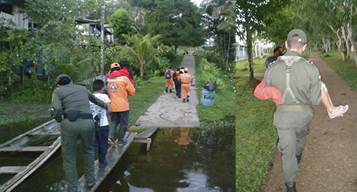 Las Tres niñas de 13, 9 y 8 años de edad y un niño de 10 años de edad, fueron rescatados luego durar perdidos en las salvajes selvas del Amazonas por más de 24 horas. Los hechos se registraron en la comunidad de Mocaua, jurisdicción del municipio de Puerto Nariño, cuando los cuatro pequeños salieron a bordo de dos canoas, sin autorización de sus padres a recolectar frutos y a bañarse en un caño afluente del río Amazonas, con el transcurso de las horas el padre de las niñas preocupado por la ausencia, informó a nuestros uniformados donde se coordinó inicialmente con la guardia indígena, una búsqueda en inmediaciones de la localidad, la cual resultó no daba un resultados positivo. Con el llegar de la noche la situación se tornó más preocupante y a la incesante búsqueda se sumaron lugareños, pescadores, y miembros de la Defensa Civil y La Armada Nacional con su equipo de navíos, lo cual permitía cubrir un mayor área de búsqueda incluso con iluminación. Nuestros uniformados del Grupo de Infancia y Adolescencia buscaron con un indígena pescador en algunos caños y recodos del rio Amazonas que por ésta época del año está inundada a más de 13 metros de altura del nivel normal, donde fueron hallados los niños quienes fueron arrastrados por las aguas al naufragar en sus canoas. Valientemente la niña de 13 años se las había arreglado para mantener a flote los otros tres pequeños utilizando gigantescas hojas como "colchones flotantes", mientras que ella soportó la noche entera con el agua a la cintura, en la penumbra de la selva y a merced de los elementos naturales, reptiles, insectos y fieras que durante toda la oscura y larga noche los atemorizaron. Luego de más de 25 horas de desesperada búsqueda los niños fueron rescatados y trasladados al hospital local, donde les diagnosticaron hipotermia, pánico y algo de deshidratación; sin embargo luego de ser atendidos y examinados y al registrar niveles seguros de salud y recuperación, fueron regresados el seno de su hogar, para felicidad de sus progenitores y provincianos.