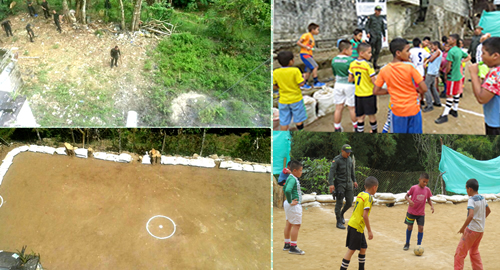 A lo largo de los años este municipio ubicado al norte de Antioquia fue golpeado fuertemente por la violencia, la presencia de grupos subversivos y bandas criminales, le dejaron una etiqueta de indeseable, intolerante, alejado y de difícil acceso.Sin embargo, el compromiso policial desdibujó esa historia. Convencidos de su lema Dios y Patria, desde el año anterior arribaron al municipio de Briceño 20 policías con la misión de brindar seguridad y proteger a las personas.No obstante con el pasar de los días, se apreciaba un entorno que carecía además de cosas materiales de otras necesidades porque aún se percibían hábitos de indiferencia y comportamientos que denotaban la faltaba espíritu entre la vecindad.Poco a poco los hombres entrenados en combate urbano fueron tejiendo lazos de amistad con sus habitantes, un cariño especial se fue consumando entre ellos y la comunidad especialmente por los niños que todas las tardes se reunían para patear una pelota, rodar las bicicletas y jugar al escondite en la parte trasera de la Estación de Policía.Un lugar que motivó al Subteniente Jhojan Villalobos Bernal, comandante de la Estación de Policia Briceño, una de esas tardes de tradicional reunión en la que Camilo un niño de la comunidad le contó de sus temores, uno de ellos es que volviera a escucharse esa época de disparos en la que todos sentían miedo, y sobre todo ahora él porque temía que al despertar ya no viera a sus nuevos amigos "los policías".Gran responsabilidad la de Villalobos quien tomó de esas palabras las agallas para cambiar esos miedos por alegrías, además de querer cumplirle a Camilo también su propósito era sembrar la esperanza y construir nuevos escenarios. Así el 30 de octubre de 2014 se comenzó la tarea transformadora y ese lote desolado cercano a la Estación el cual es de propiedad del municipio tiempo después sería una gran cancha de mini-fútbol.La idea fue presentada al señor Alcalde, que respaldó totalmente la iniciativa y para agilizar las de este joven Comandante de Estación, le brindó apoyo de la autoridad local, también se unió Don Manuel, jefe de obras de su administración quien además de pasar la retroexcavadora ayudó a alimentar este sueño y consiguiendo la solidaridad de otros habitantes prestaron herramientas como palas, picas y la donación de 12 cargas de arenilla.Mientras tanto los 20 hombres mañanas y tardes disponibles y hasta en su descanso decidían pasar su tiempo en la obra, limpiaban el lote, sacaban piedras, basura, escombros además de llevar la arenilla en costales pues no había forma de entrar un vehículo hasta el lugar; mañanas y tardes, todos los días de la semana estos policías aportaban en sus descansos llenando costales, regando la tierra, limpiando la maraña; más de 10 meses de ampollas y largas jornadas de sol pronto valdrían la pena. El pasado 21 de febrero con la gracia de sus vocaciones y la infinita solidaridad se logró sacar avante este proyecto para la comunidad. Hoy en día como al comienzo de esta historia a la misma hora pero en otro lugar una cancha de mini fútbol los espera.Niños, niñas y adolescentes nunca faltan a su cita y como uno paso hace un par de fines de semana a las 9:00 a.m. muy puntuales llegaron aproximadamente 50 niños, en compañía de padres y vecinos de todas las edades, se llevaría a cabo el primer "torneo rápido de banquitas"Ya son 8 equipos y ver los niños correr o escuchar un pito sonar, además de los policías de la Estación animar y a la comunidad unida, es casi que estar recogiendo el fruto de la semilla sembrada; esto una vez más se reafirmó el honor de servir con el corazón.Esta es la historia del patio trasero de una Estación, que cambió se convirtió en la puerta de entrada a la alegría al deporte, quedaron atrás los malos recuerdos y se hizo una obra que por siempre permanecerá como la huella imborrable de amistad entre estos policías y la comunidad de Briceño.