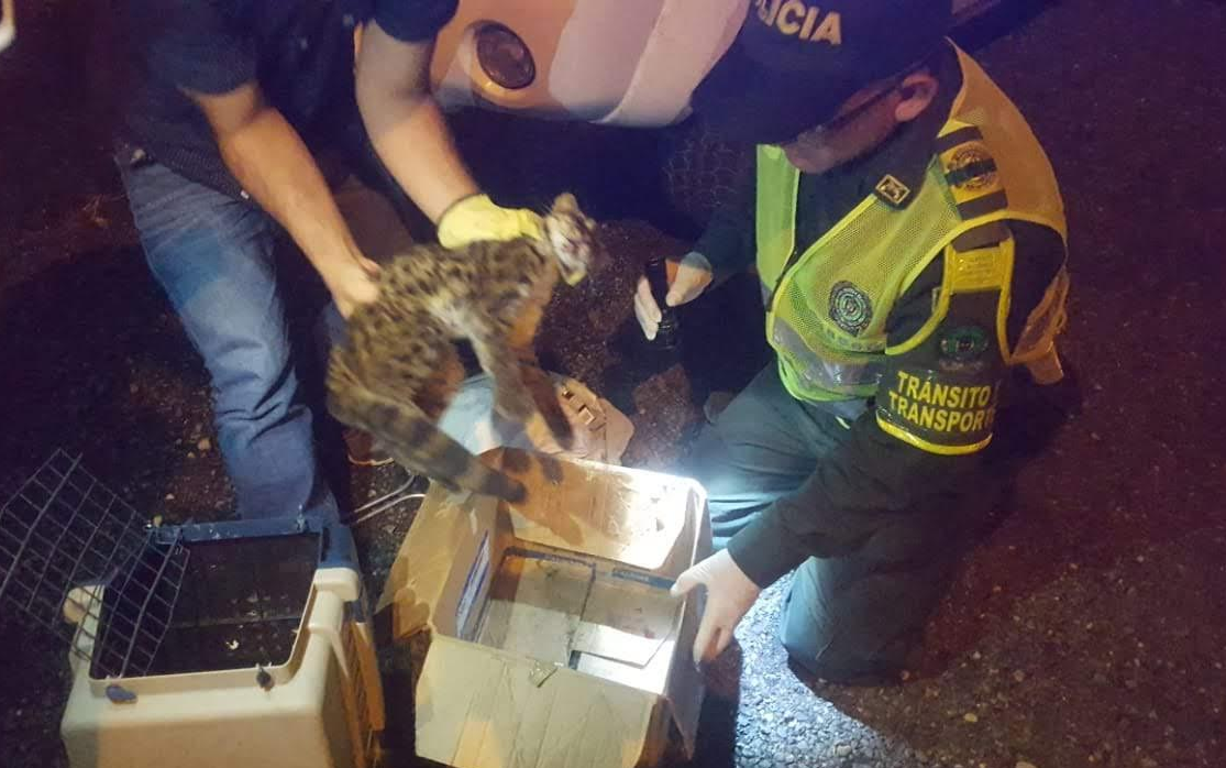 Uniformados de la Seccional de Tránsito Y Transporte adscritos al departamento de Policía Caldas, salvaron la vida de tigrillo que minutos antes, había sido atropellado por un vehículo en la ruta Manizales – Medellín.