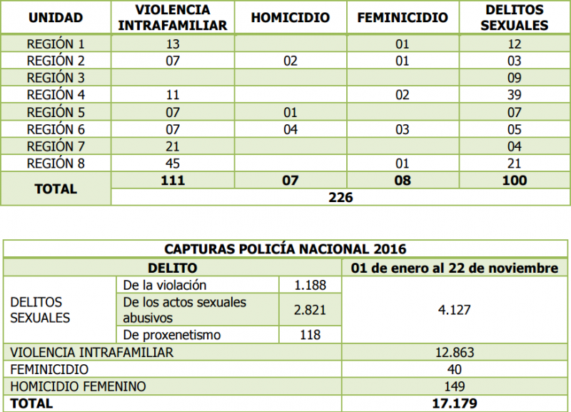 Así mismo, en lo corrido del año 2016, la Policía Nacional ejecutó diversas operaciones en pro de la disminución de los índices de violencia contra la mujer, las cuales arrojan a la fecha la captura de 17.179 personas por delitos sexuales, violencia intrafamiliar, feminicidio y homicidio femenino.